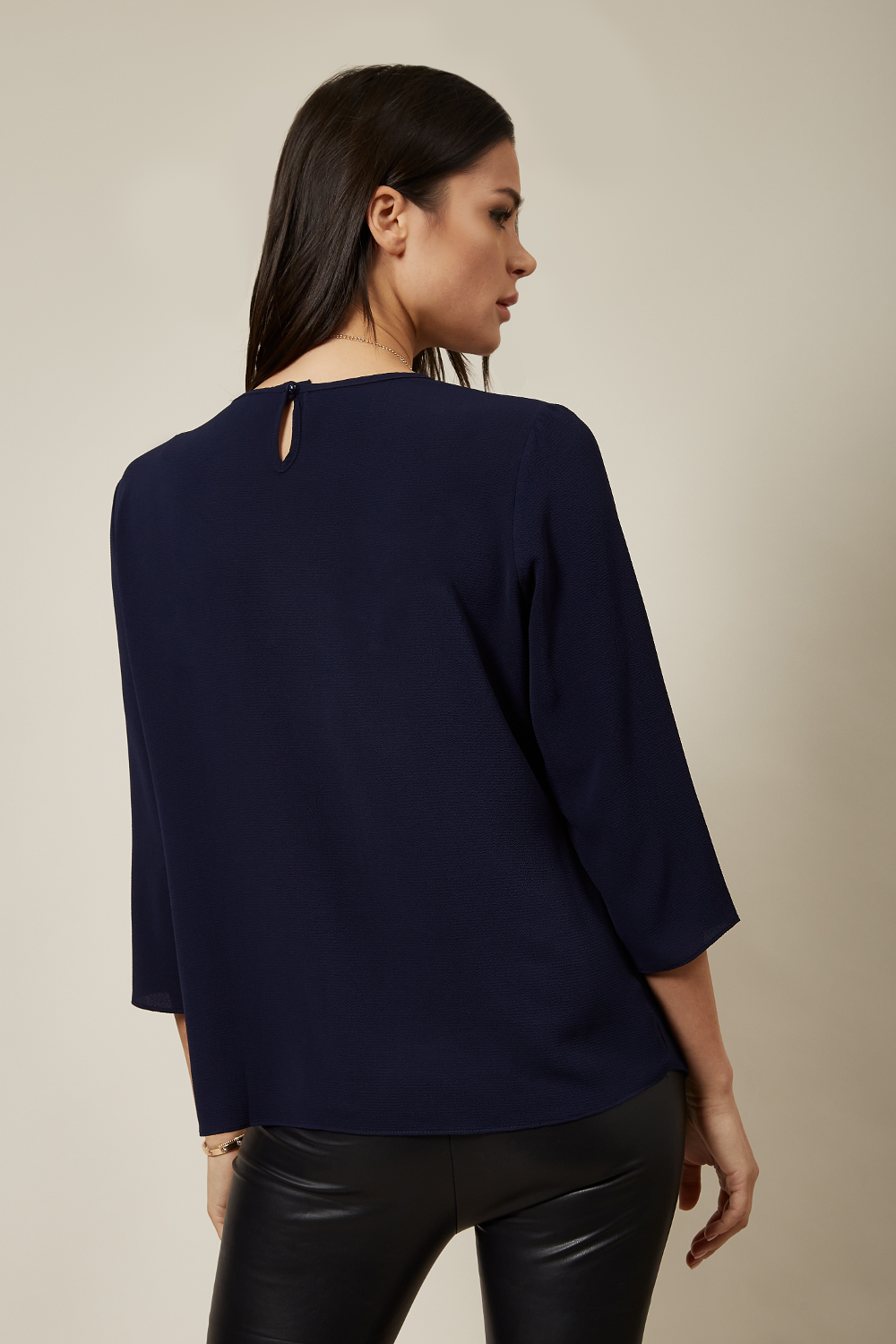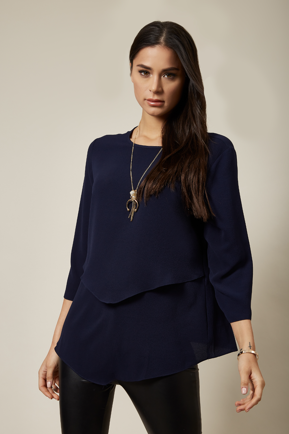 3/4 Sleeve Relaxed Layered Top With Necklace In Navy