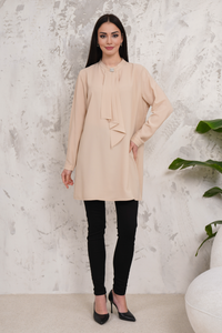 Elevate your style with the Oversized Long Sleeves Brooch Detailed Tunic . The loose fit and long sleeves provide comfort, while the brooch detail adds a touch of sophistication. Whether you're heading to the office or a casual outing, this versatile tunic effortlessly adapts to any occasion. The hue complements various bottoms, making it a wardrobe essential. The brooch detail on the neckline brings a hint of glamour, making this tunic a standout piece. Embrace timeless elegance and modern comfort with this chic beige tunic, perfect for a fashion-forward look.