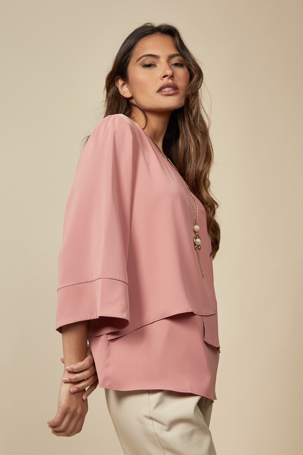Layered Top With 3/4 Sleeves in Pink with Necklace