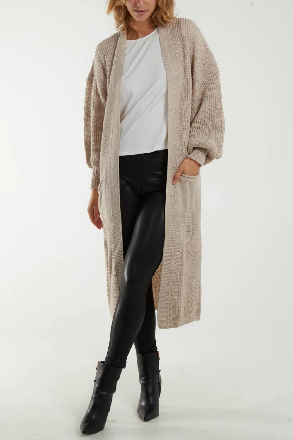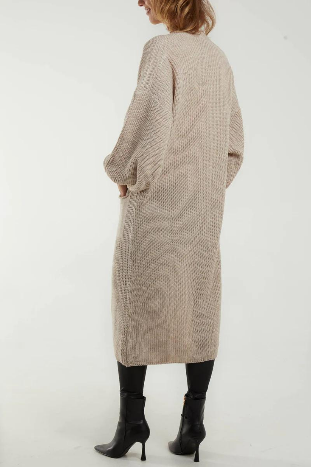 Oversized Long Sleeves Midi Knitted Cardigan with Pocket Details in Beige