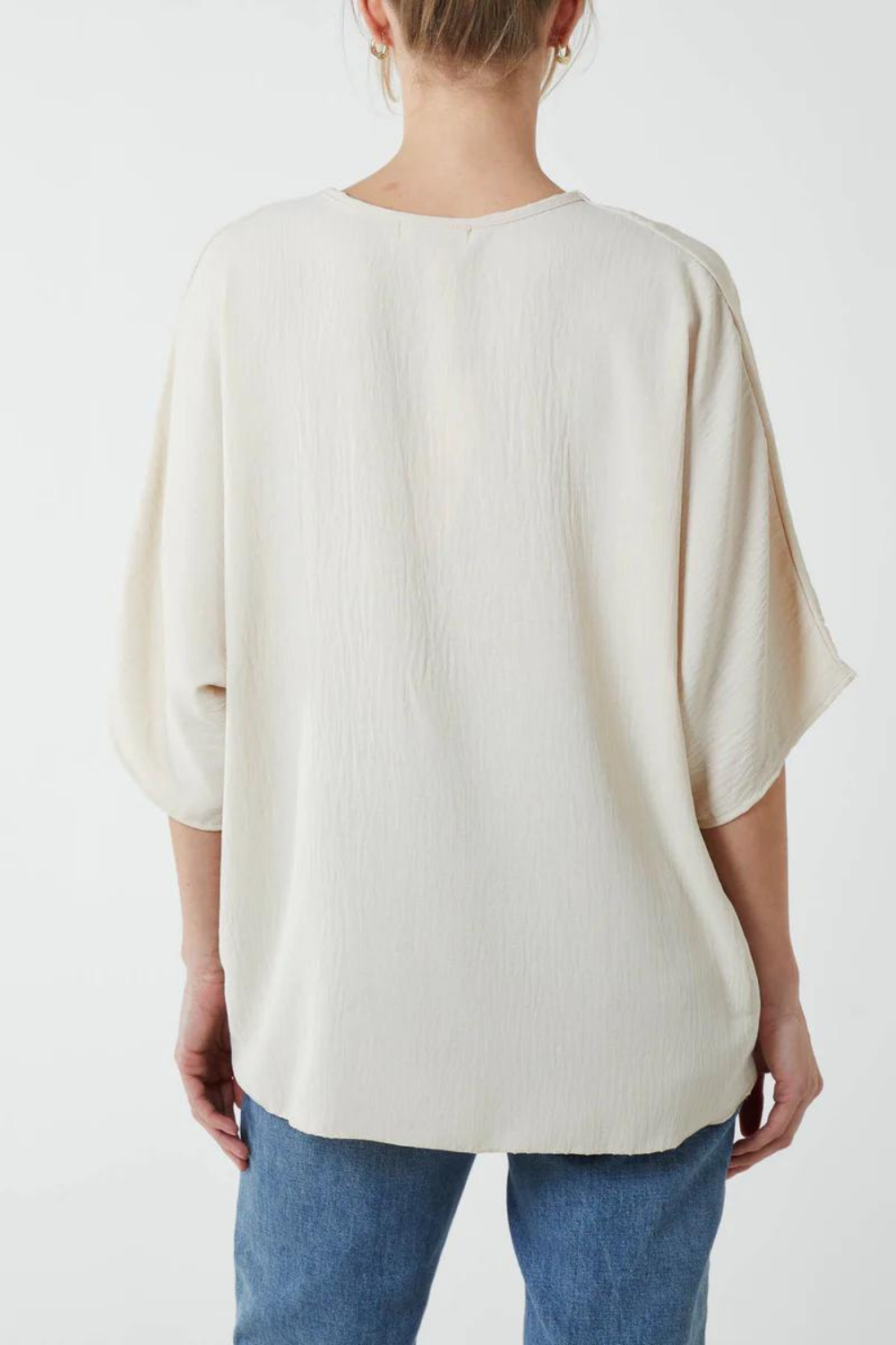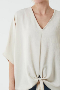 Oversized V Neck Tie Detailed Top with 3/4 Sleeves in Beige