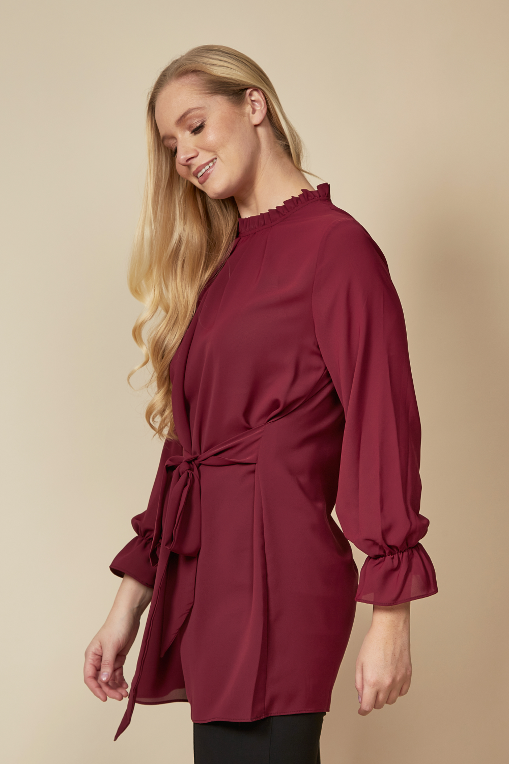 Oversized Tie Ruffle Neck Top with Tie Waist Detailed in Burgundy