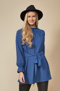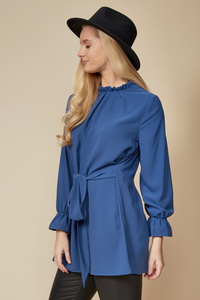 Oversized Tie Ruffle Neck Top with Tie Waist Detailed in Blue