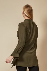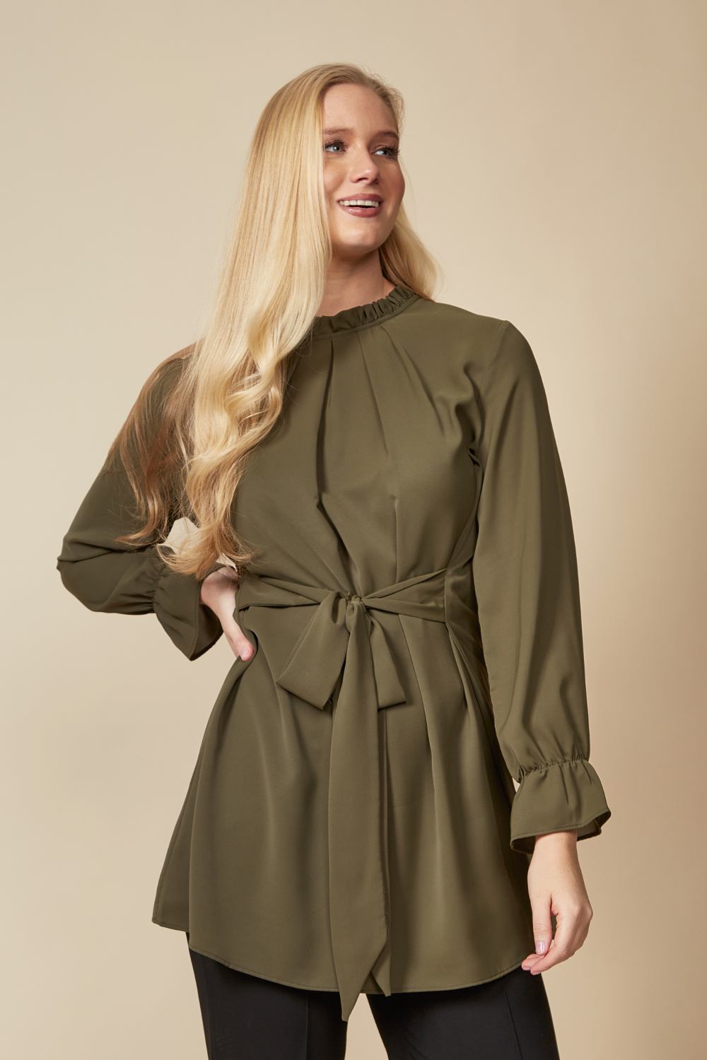 Oversized Tie Ruffle Neck Top with Tie Waist Detailed in Khaki