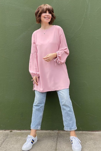 Oversized Tie Detailed Long Sleeves Crew Neck Tunic with Necklace in Pink