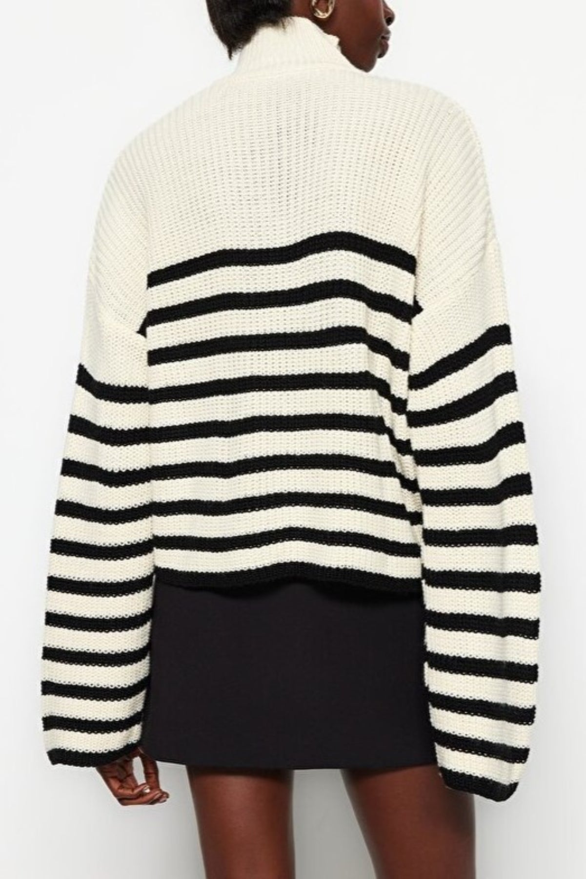 This oversized high neck striped knit sweater offers both comfort and style, crafted from soft acrylic for warmth and easy care. Its relaxed fit and high neckline provide cozy coverage, making it a versatile layering piece perfect for cooler days. The classic striped pattern adds a timeless touch, ensuring it complements any casual wardrobe with effortless sophistication.