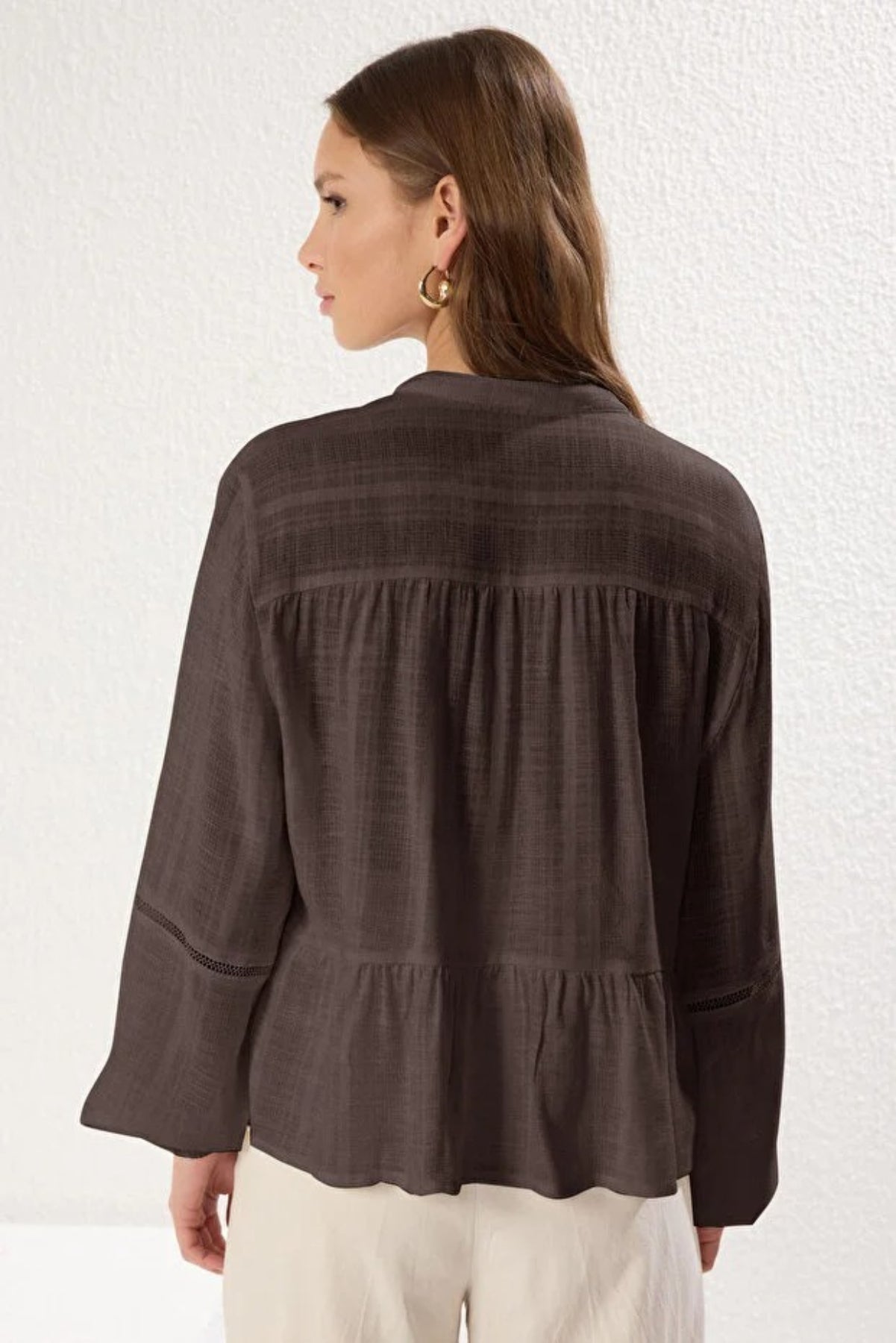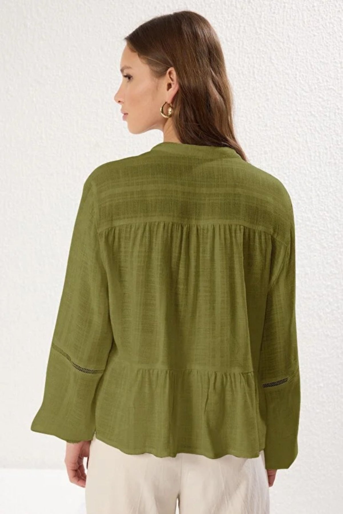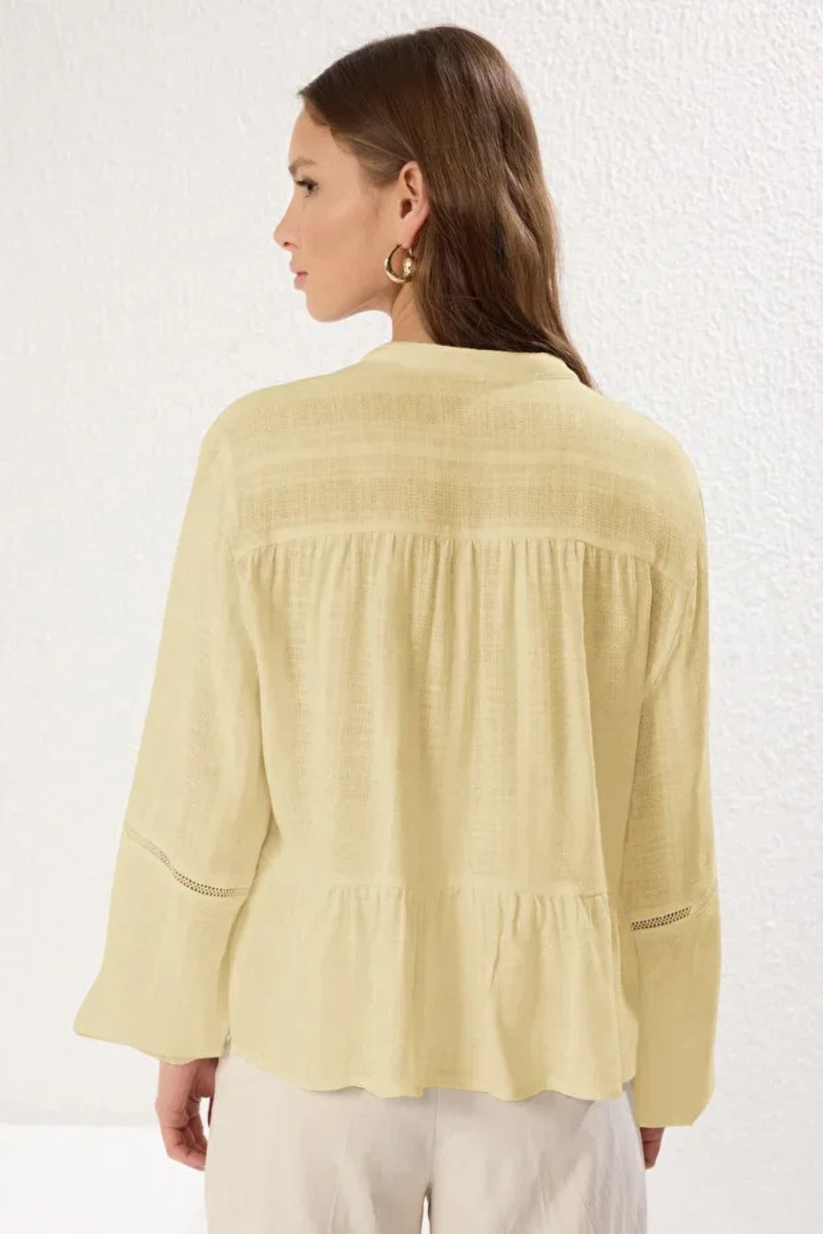 This refined cotton-textured woven shirt features a regular fit designed for comfort and style. The elegant lace detailing on the sleeves adds a delicate, feminine touch to the sophisticated V-neck silhouette, making it perfect for both professional settings and elevated casual looks.